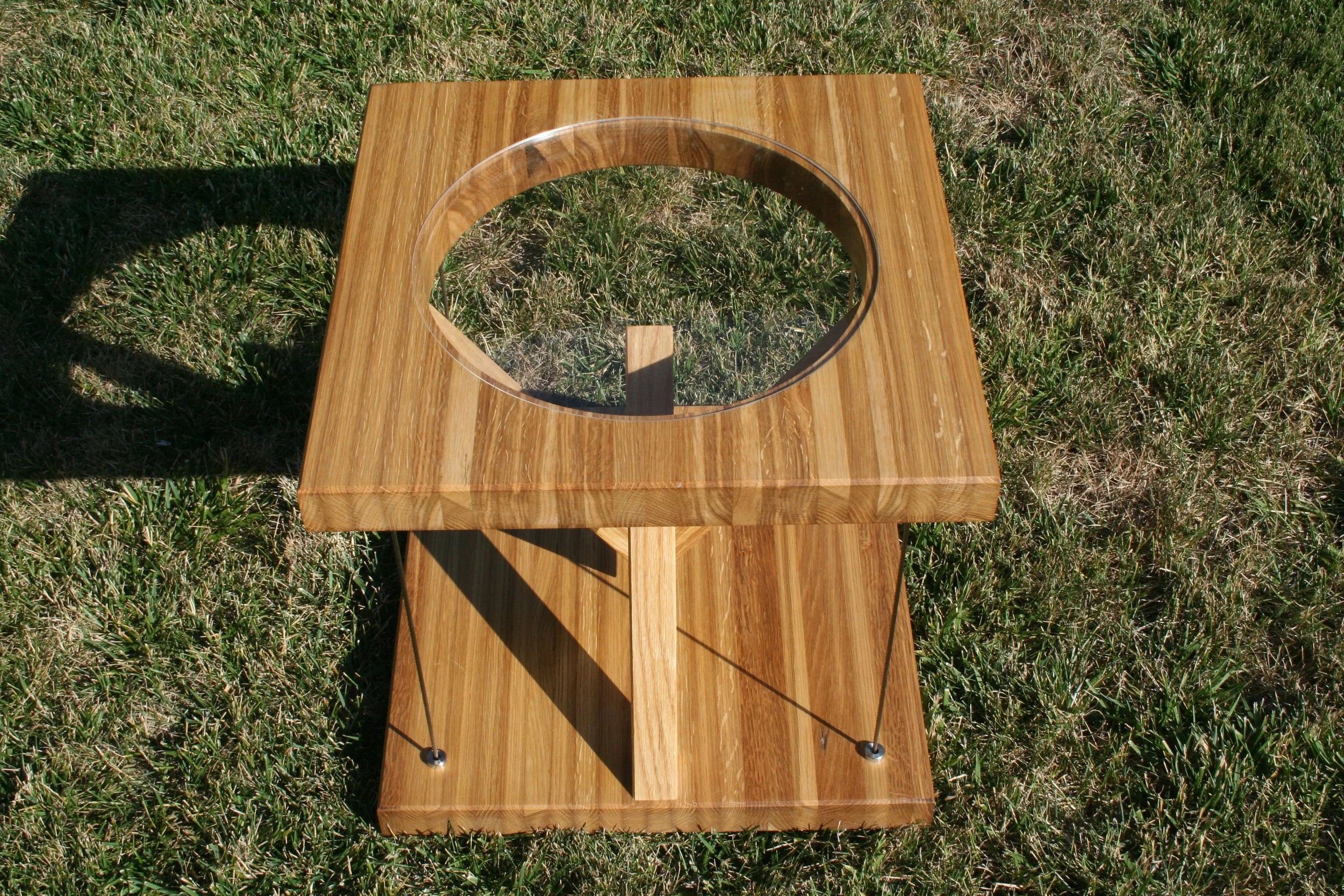 Build out of white oak and steel cable, the two halves of this end table hover about an inch away from each other. The top cutout, with plexiglass insert, gives a unique view into the illusion of the floating ends. Finished with a durable polyurethane, this table provides not only a functional piece of furniture, but a visually engaging one as well.