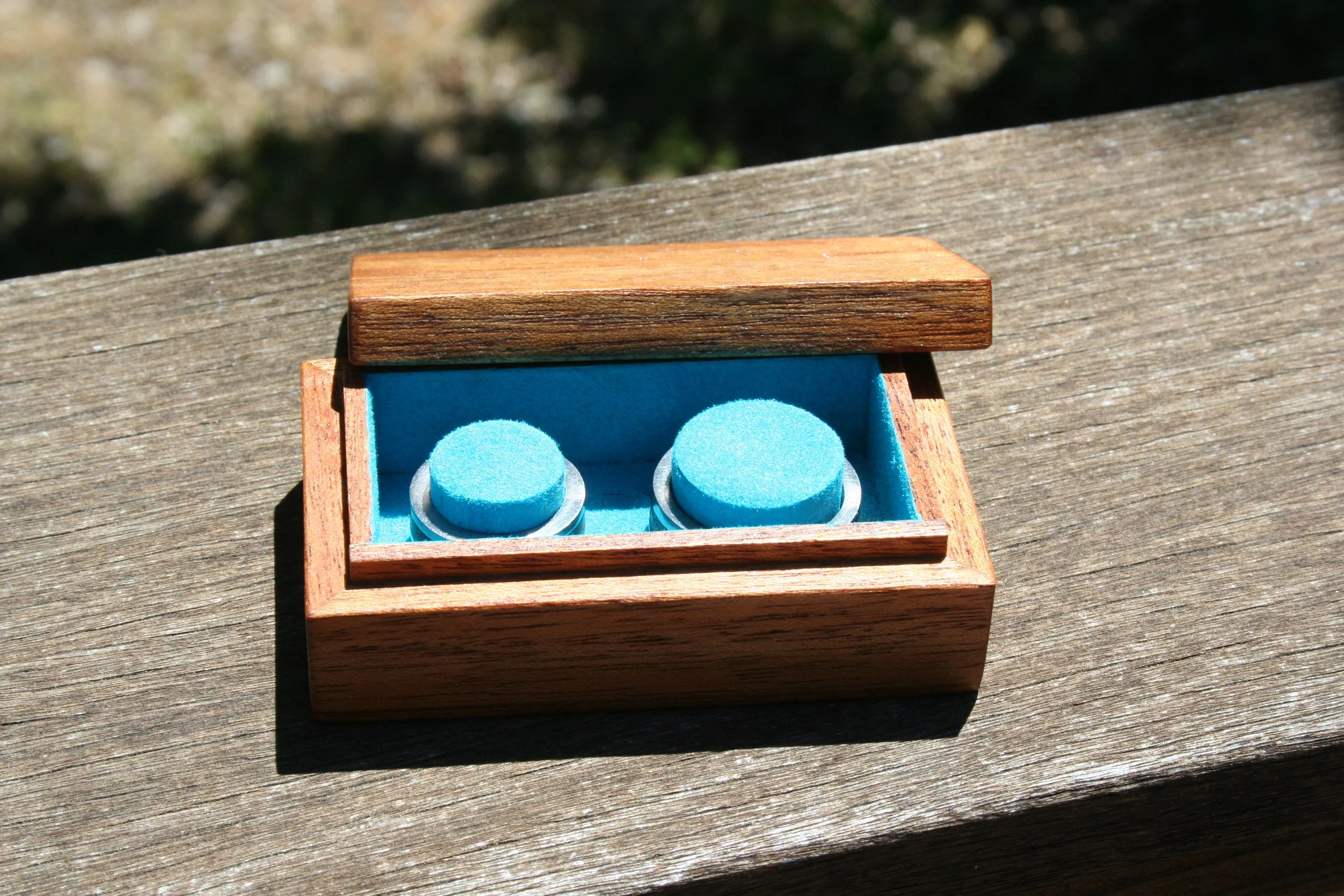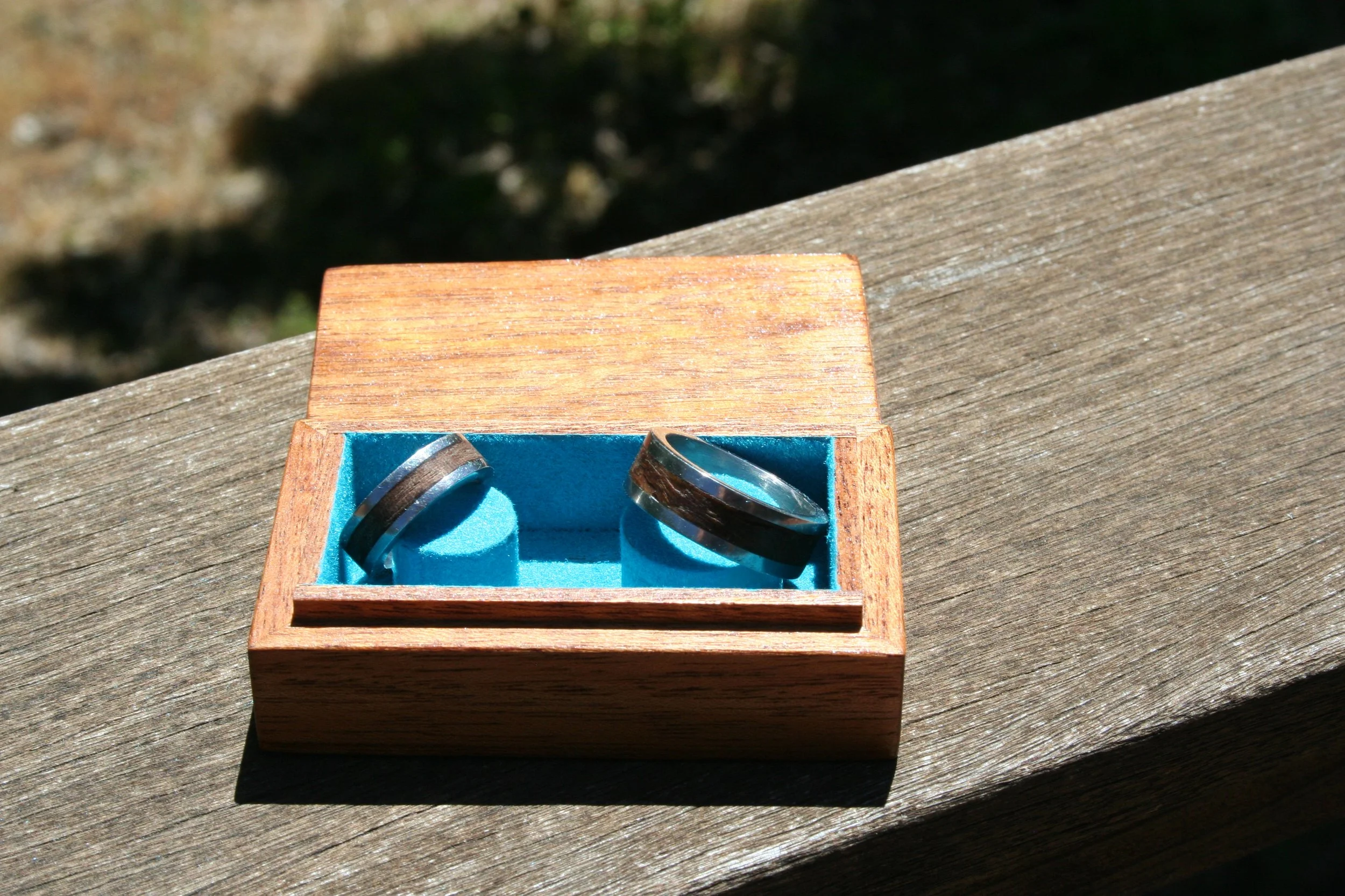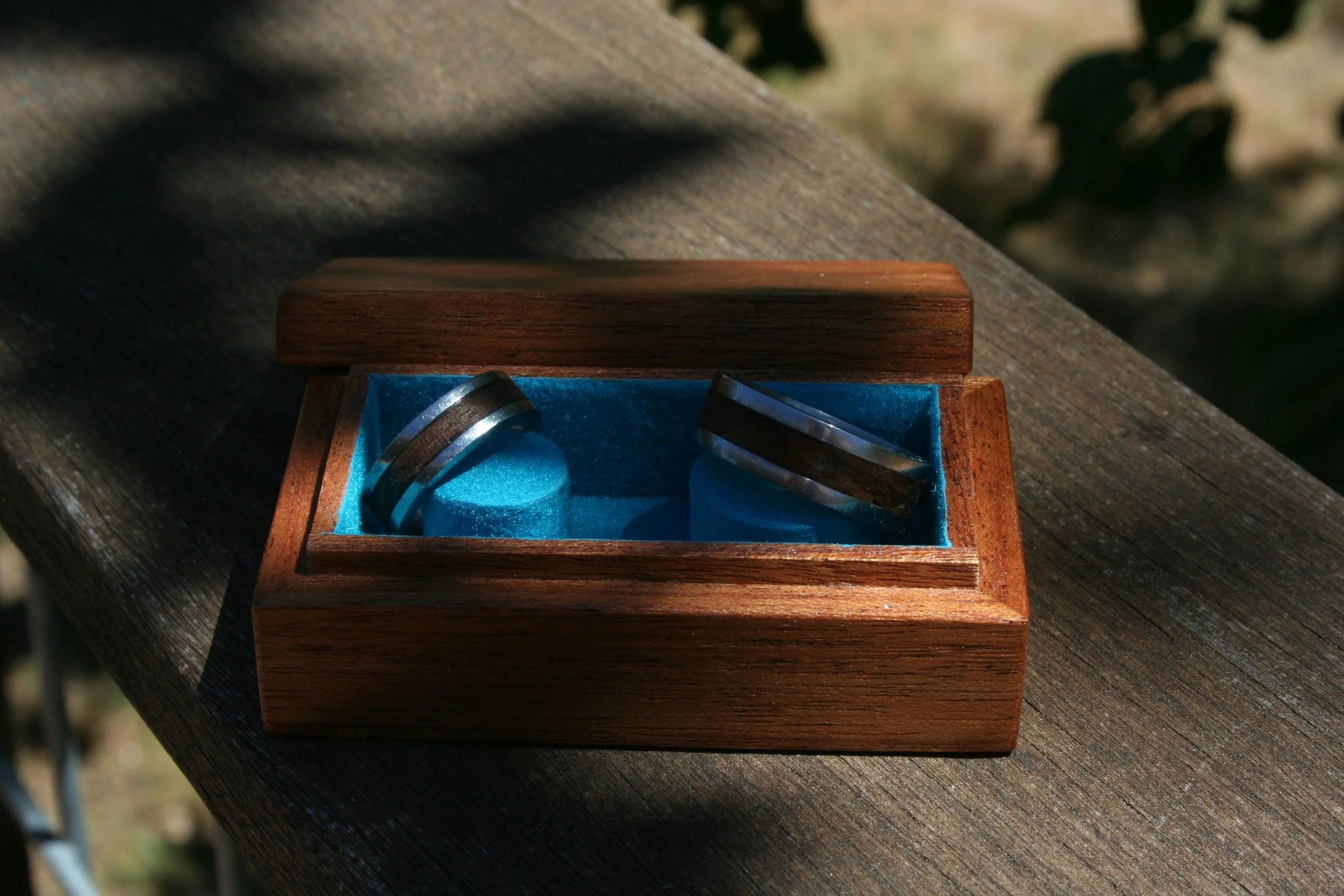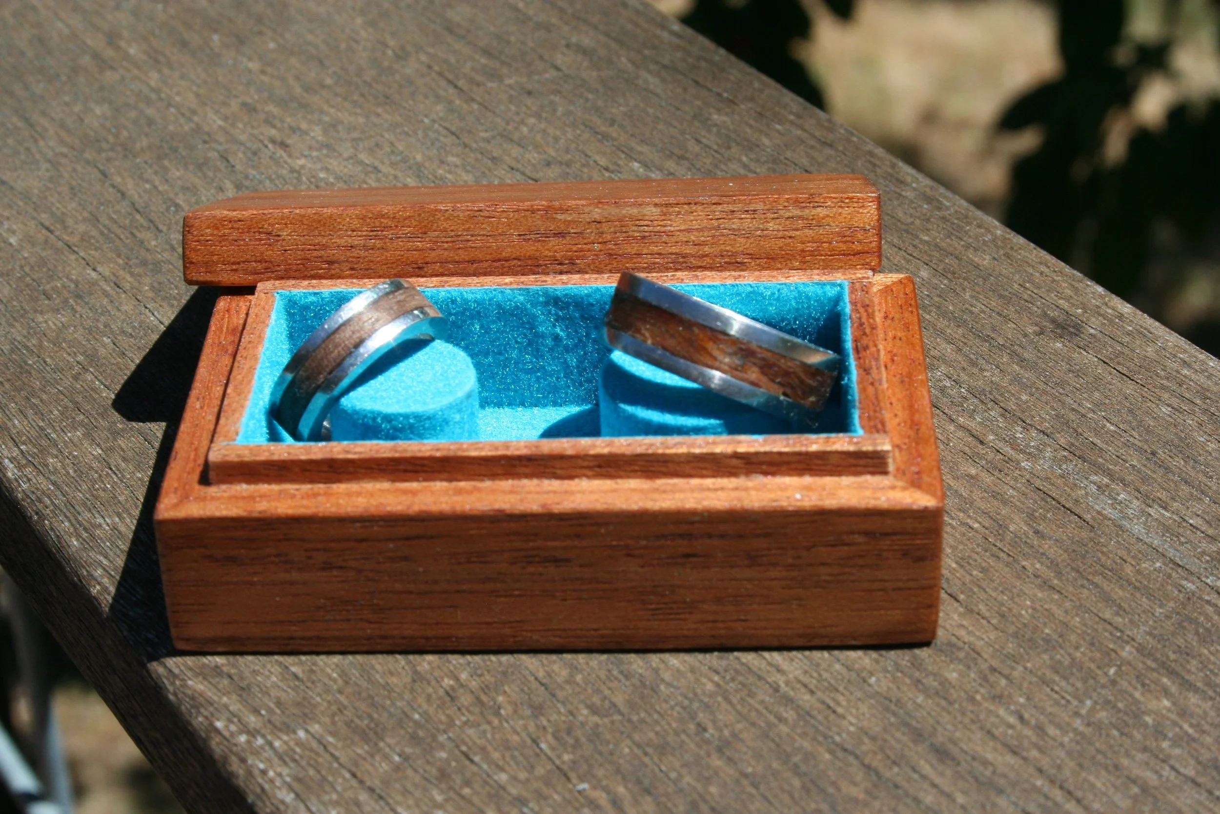 I started with stainless steel hex nuts and, using a multitude of the wrong tools, sanded them into the desired dimensions. I then carved a groove down the middle and inlaid wood veneer. To keep the rings safe, I created a small ring box out of sapele wood, with ring posts, and flocked the interior.