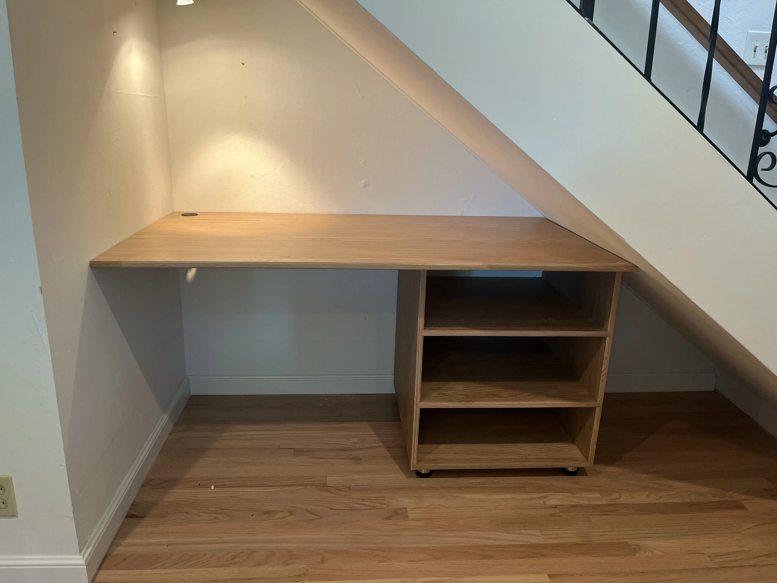 Desk and shelf under stairwell